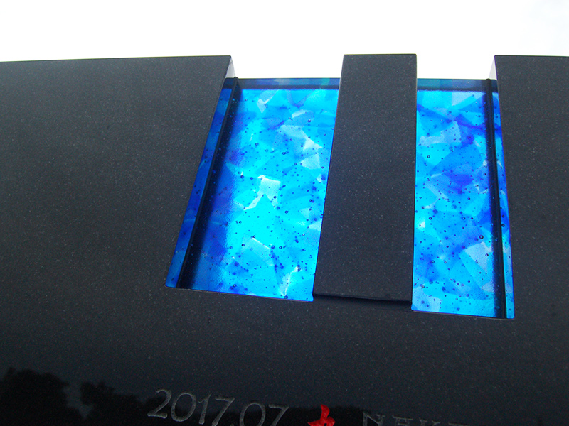 石塔の間にもガラスを挟め、セパレートされた御影石を一体化しました。