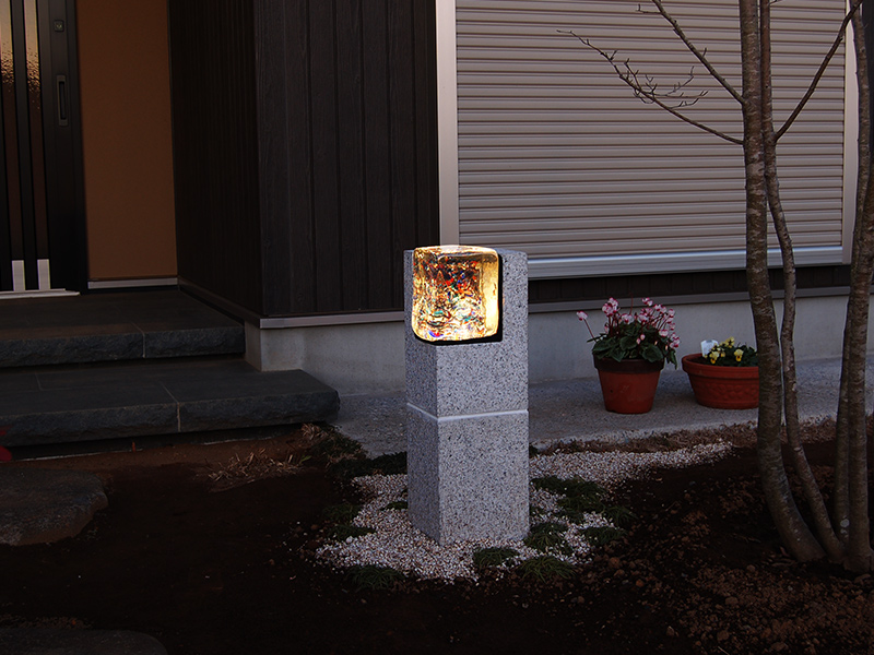 お庭の燈籠。ガラスの中の気泡と、不規則なカタチや色の「ゆらぎ」が、温かく迎えてくれる。